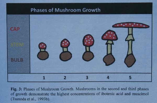 Je suppose que dans un champignon séché, au fil des mois, l’acide iboténique se dégrade probablement lentement en muscimol et le champignon perd lentement son effet « stimulant »/énergisant.